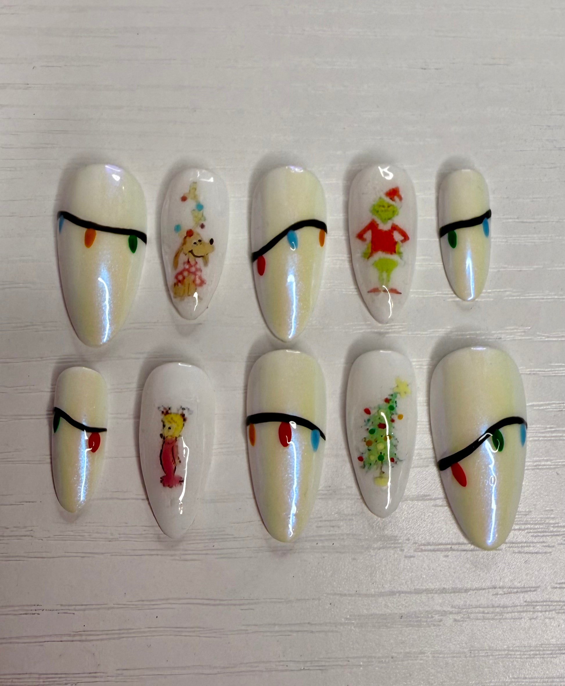 These nails were hand crafted and took 2 and a half hours. These nails were inspired by the show "The Grinch who stole Christmas."